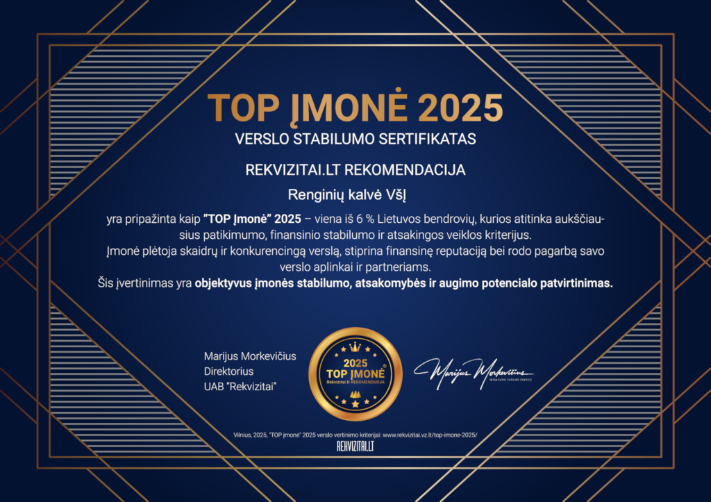 Top Įmonė 2025 – organizatorių veiklos patikimumas ir stabilumas nepriklausomai įvertintas ir organizacija tituluota, kaip „Top Įmonė 2025” pagal visų metų rezultatus.